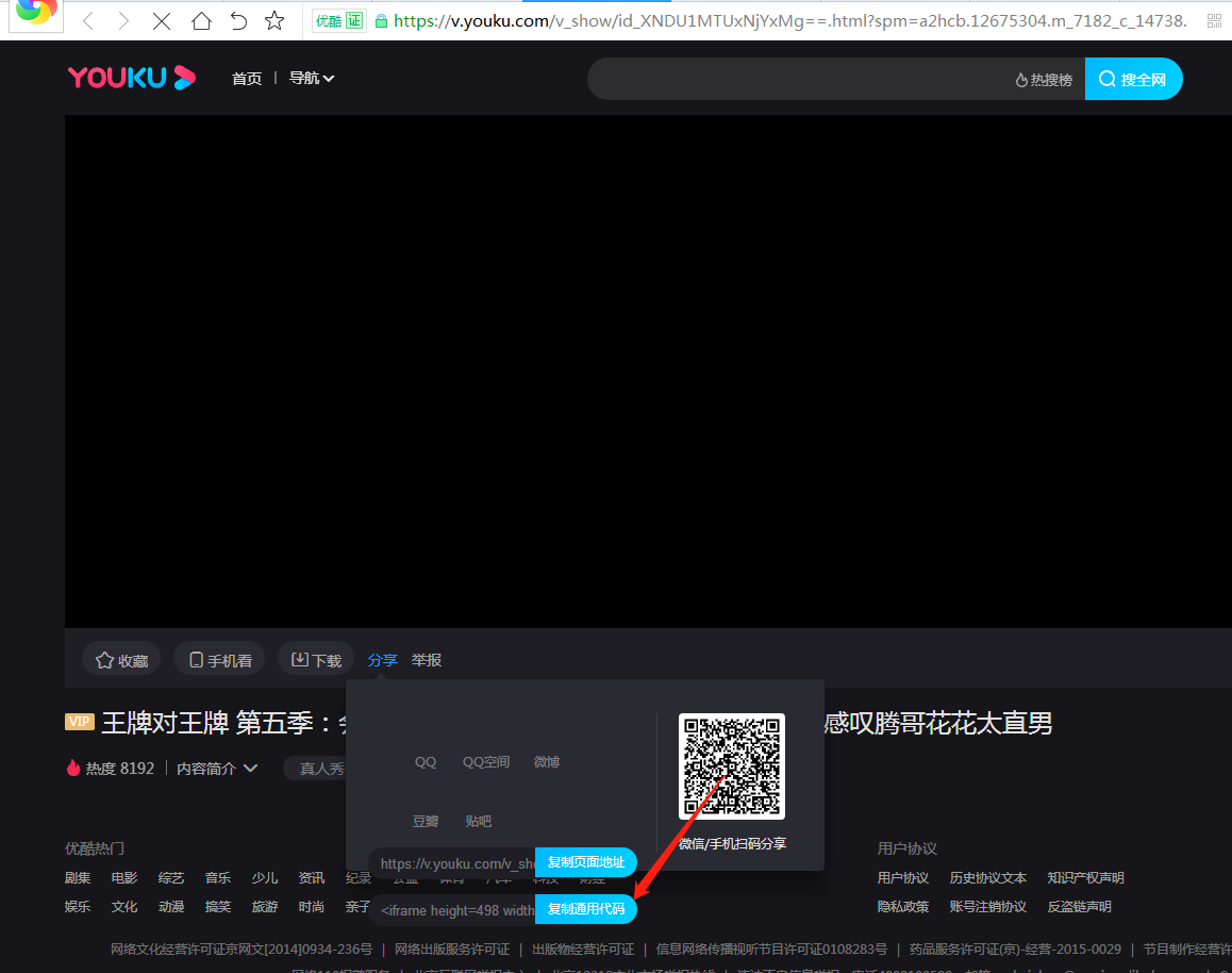 2.審核通過后,點擊視頻,會有一個分享按鈕,如下圖,將通用代碼復制到記事本內備用